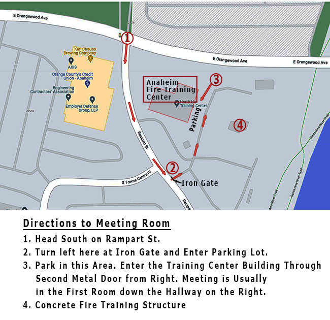 Monthly meetings are held on the fourth Tuesday of each month, 7:00 PM. We meet at the Anaheim Fire Training Center located at 2400 E. Orangewood Ave, in Anaheim.